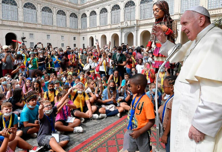 El Papa, junto al cardenal Michael Czerny, ha recibido en la plaza de san Pedro a la marioneta Amal, símbolo de todos los niños migrantes del mundo
