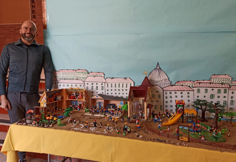El profesor Rubén Sanz Victoria, del colegio María Auxiliadora de las salesianas de Zaragoza, ha elaborado una serie de escenas del oratorio de Turín en una gran maqueta realizada con clicks de Playmobil