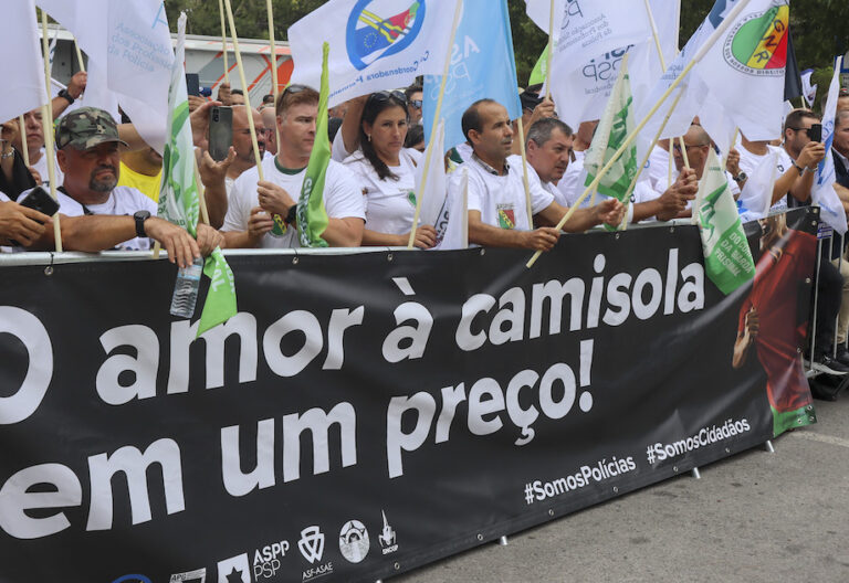 Los agentes de seguridad se han manifestado cargados con las banderas de sus sindicatos y vestidos de paisano durante la visita del Papa al Palacio de Belém