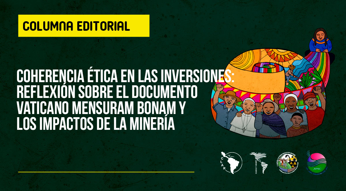 El artículo que presentamos parte de un análisis del documento ‘Mensuram bonam’ y se enmarca en las propuestas que viene haciendo la Red Latinoamericana Iglesias y Minería en el marco de la Campaña de Desinversión, para promover alternativas éticas en las inversiones de las organizaciones basadas en la fe. Este proceso es fruto de años de acompañamiento a territorios afectados por el modelo económico extractivista, con énfasis en las violaciones a los derechos humanos y de la naturaleza perpetrados por las empresas mineras, que, a su vez, ocupan importantes lugares como beneficiarios de inversiones en la economía mundial.
