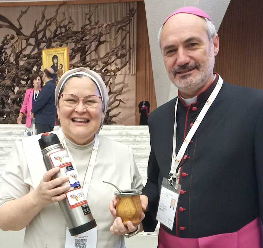 La Hna. Lucía Valladares, misionera digital, probó el mate, llevada por su curiosidad, en la primera Asamblea del Sínodo en octubre de 2023. Me comentó que le había gustado pero que no podía conseguir el recipiente, es decir el mate para poder tomar.