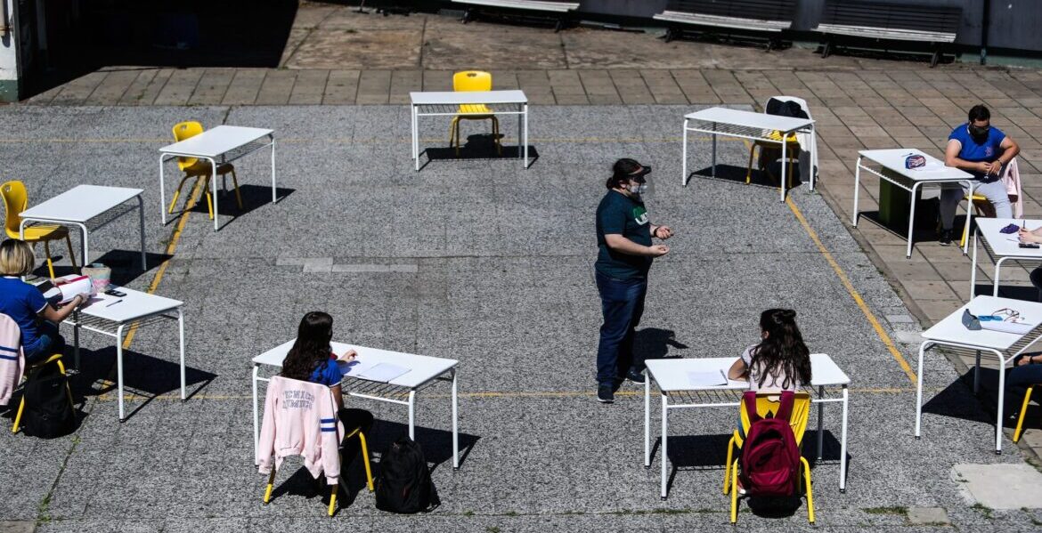 Jóvenes del ultimo año de la escuela secundaria regresan a los colegios de Buenos Aires tras el confinamiento. EFE/Juan Ignacio Roncoroni