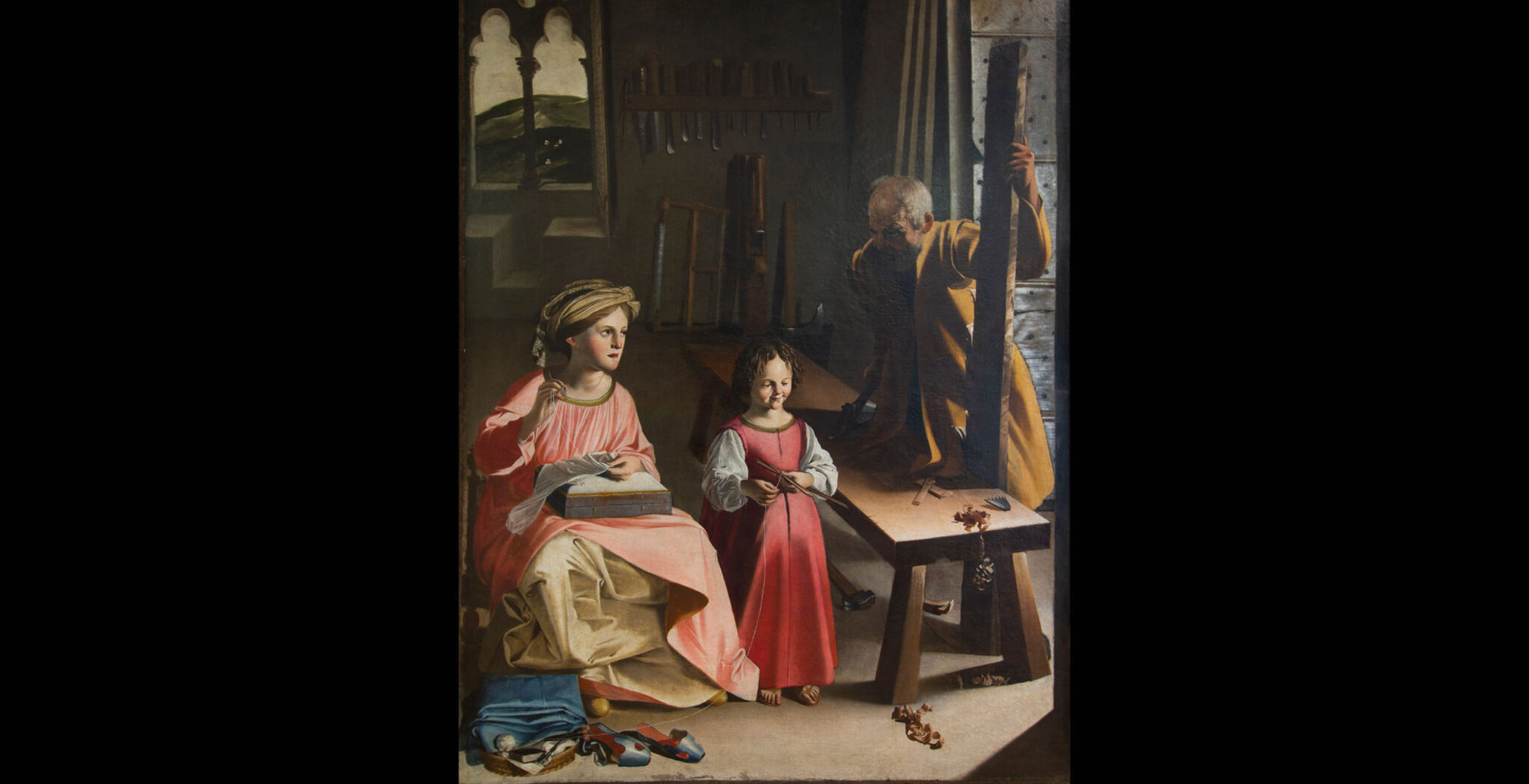 Con amorosa humildad evangélica, el pintor retrata un sinfín de cosas esparcidas por el taller, desde virutas en el suelo, hasta los utensilios de trabajo de la Virgen y unos zuecos abandonados en el suelo. Todo forjado por ese hombre sabio. Es quien diseñó, construyó y equipó la gran sala, incluida la magnífica ventana con parteluz que se puede ver en la parte inferior, haciendo que parezca una catedral más que un taller. Y quien ha moldeado el clima familiar y moral que genera tanto la quietud de la joven esposa absorta en sus pensamientos, como la creciente conciencia del niño divino en el momento mágico del primer descubrimiento de la familia que lo rodea y del mundo que se abrirá ante él.