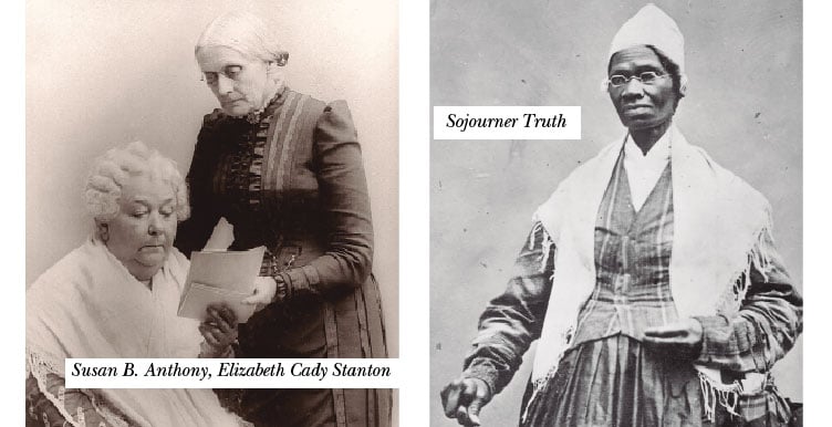 ¿Quiénes eran Susan, Elizabeth y Sojourner, mujeres de diferentes orígenes y trayectorias unidas por el compromiso civil y las batallas pre-feministas? Susan Bromwell Anthony (15 de febrero de 1820 – 13 de marzo de 1906) nació en el seno de una familia abierta y progresista, de religión cuáquera, que la empujó a cultivar su viva inteligencia, a estudiar y a desarrollar la autonomía. Fue su padre con sus enseñanzas quien llenó el vacío de una educación escolar diseñada para favorecer a los varones. La futura sufragista descubrió el compromiso con la igualdad de la mujer gracias a su maestra Mary Perkins, quien le transmitió una concepción progresista de la condición femenina. En 1840 Susan se convirtió en maestra y activista a la vez. Su primera batalla fue a favor de la igualdad salarial, algo impensable en ese momento.