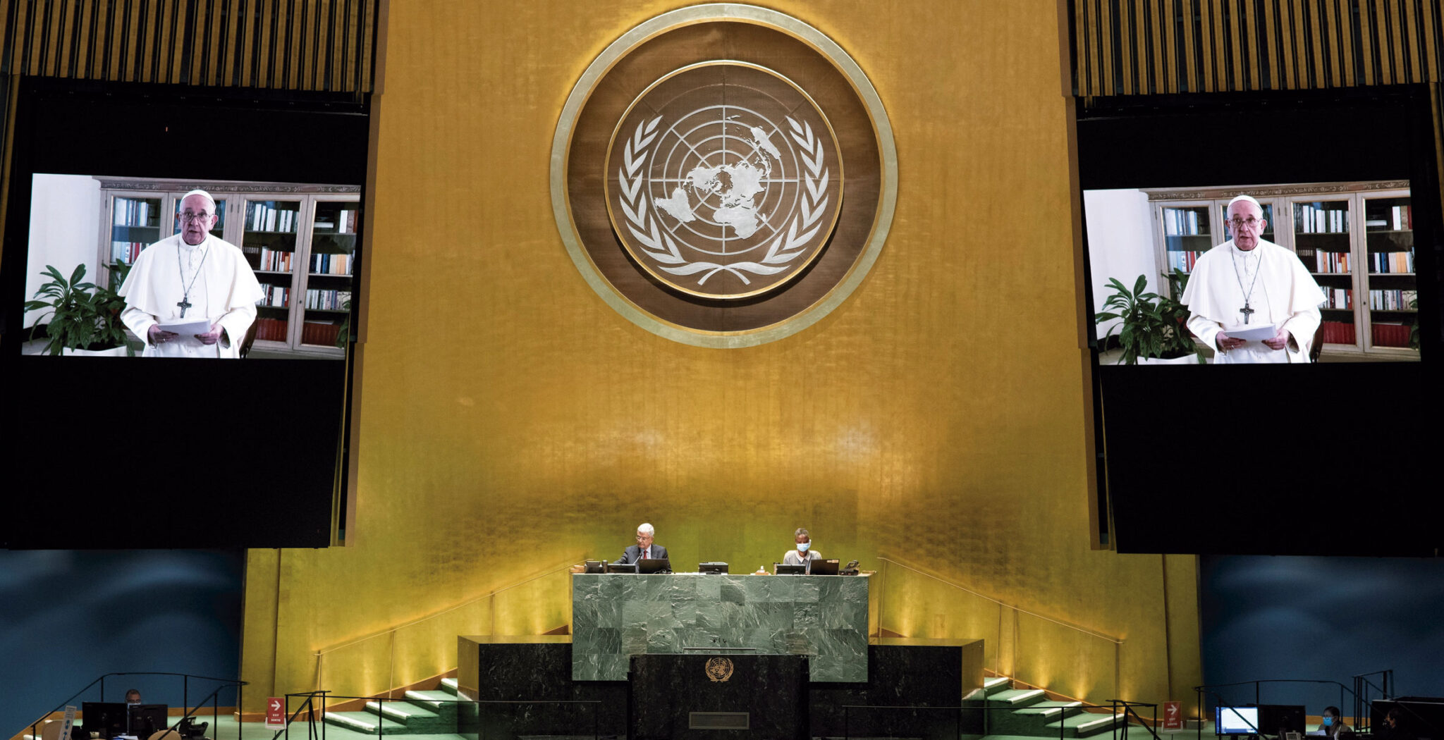 En el 75º aniversario de la creación de las Naciones Unidas, Francisco subraya que la reforma del sistema resulta esencial para imponer “límites jurídicos precisos que eviten que se trate de una autoridad cooptada por unos pocos países… que sea deslegitimizada… y que pueda ser vista como el desarrollo y la promoción de la soberanía del derecho, sabiendo que la justicia es requisito imprescindible para obtener el ideal de la fraternidad universal” (punto 173).