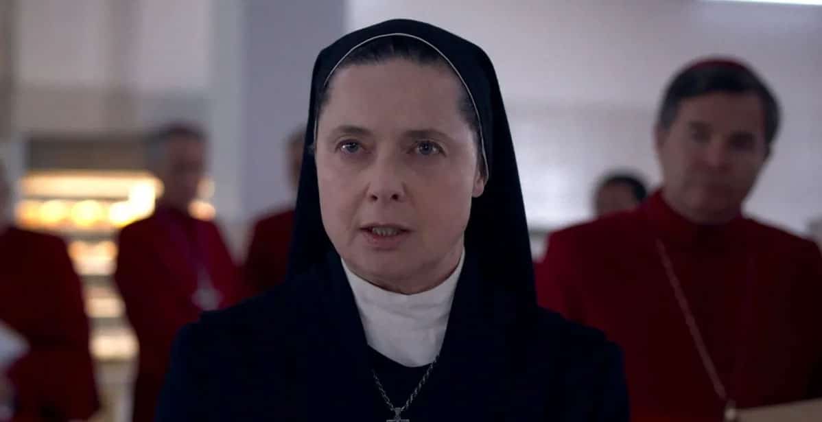 Son todos hombres. Hay un pequeño ejército de monjas que tienen que preparar las comidas y mantener las habitaciones limpias durante el aislamiento de los purpurados. Como es habitual, la mujer tiene un papel secundario. No es lo que parece. La generala del pequeño ejército, Sor Agnes, interpretada por Isabella Rossellini, será la piedra angular de la historia. Es bonito que ella resista con obstinada dignidad al desconfiado cardenal Fiennes. Y que defiende con fervor a una hermana catapultada contra su voluntad al centro de una intriga. Que pronuncie esta frase memorable: “Nos creéis ciegas, sordas y mudas. Pero oímos, vemos y hablamos”. Dice la verdad. El sentido de la historia se atribuye a la mujer, a la hermana, a su valentía, a la intensa interpretación de Rossellini. Será ella quien permitirá a esos cardenales seguir adelante.