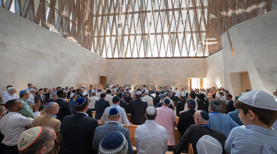 Un tercer volumen es dedicado a la Sinagoga. Un cubo caracterizado por planos que se entrecruzan en forma de líneas oblicuas, asemejando palmeras o ramos verdes, que se mezclan como capas para dar lugar al espacio interior, en reminiscencia la fiesta judía del Sucot o de las Tiendas, con lo que se rememora el sentido de camino, peregrinación, y de encuentro del culto hebreo.