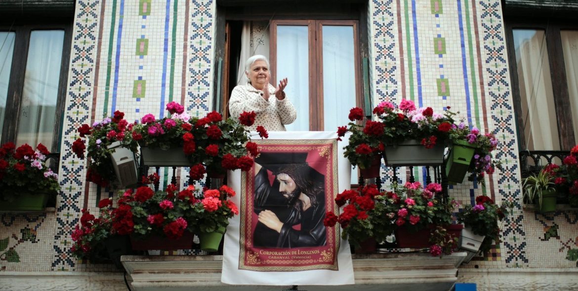 Una vecina del barrio del Cabañal (Valencia) aplaude desde su balcón engalanado con motivos religiosos. EFE