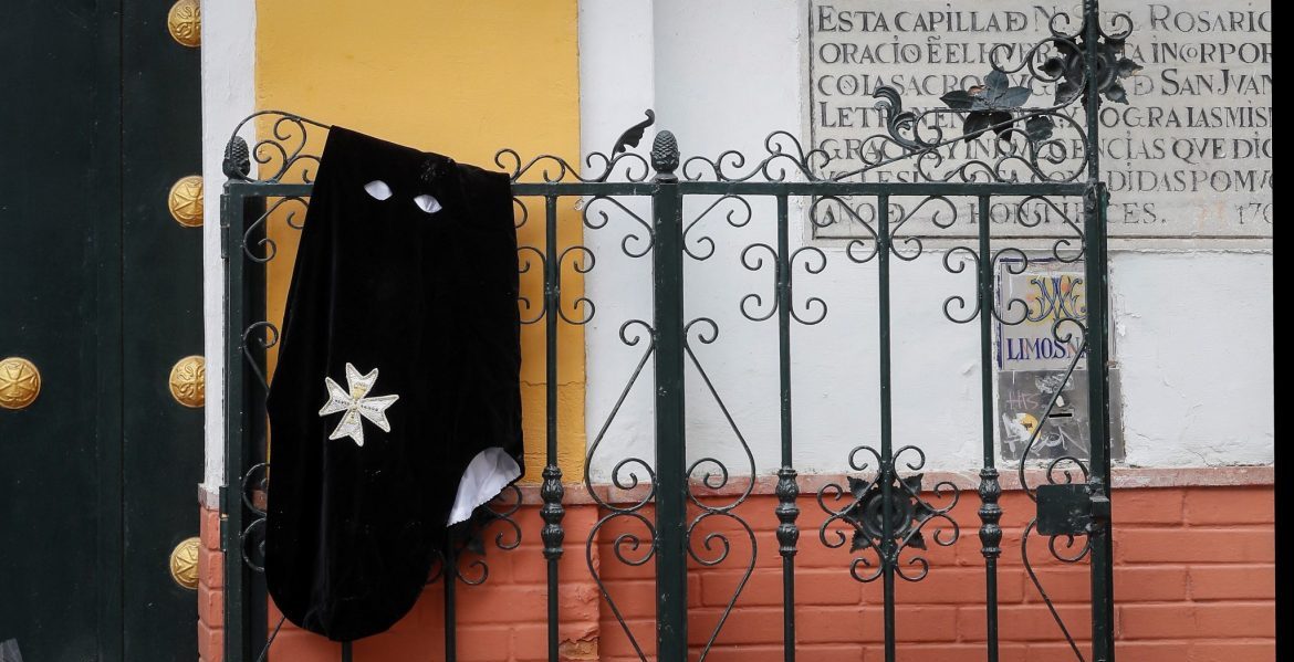 Mensajes escritos en una mascarilla y en los ramos de flores colgados en la reja de la Basílica de Santa María de la Esperanza Macarena en Sevilla. EFE