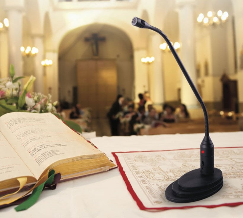 Los micrófonos Belltron son ideales para las iglesias, oratorios, salas de conferencias, teatros. Para la liturgia es fundamental que los micrófonos cumplan con criterios muy específicos: la reproducción de alta calidad de voz y canto tienen que ser capaces de detectar la voz desde una distancia considerable, ser cuanto más insensibles al ‘feedback’ y tener un diseño esencial y elegante.