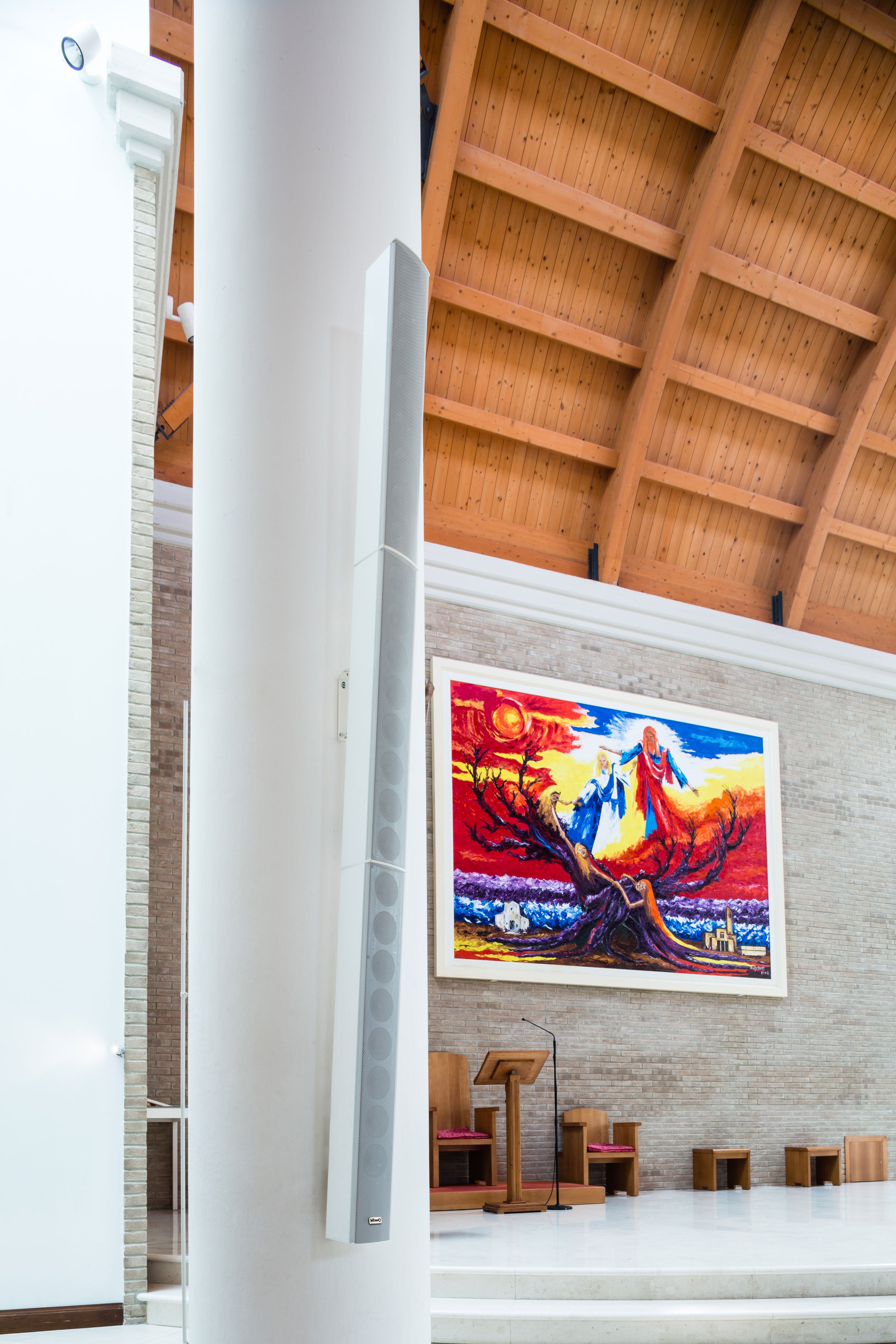 A lo largo de los años Belltron ha desarrollado productos cada vez más refinados y diferenciados para satisfacer necesidades y resolver problemáticas peculiares de lugares con una acústica compleja. Hay una variedad de modelos de columnas sonoras ideales para la sonorización de ambientes con reverberación, adecuados para la reproducción de voz y/o de la música, para hacer llegar con claridad la Palabra a todos los rincones de la iglesia. En cada modelo el diseño está pensado para que el impacto visual sea mínimo teniendo la posibilidad de personalizar colores y acabados según necesidades.