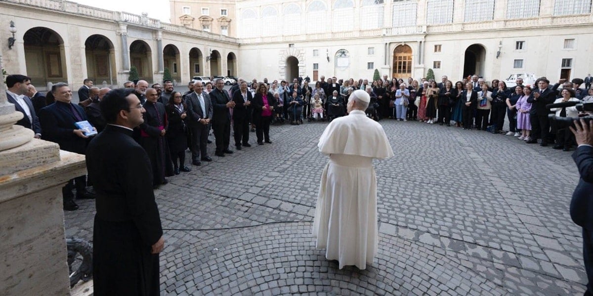 “Buenas tardes. Bienvenidos a Roma, el lugar del martirio de San Pedro. En este año Santo, que es Año de Esperanza, los saludo muy brevemente. Es una alegría poder encontrarme con todos ustedes. Y dar una bendición. Tienen en sus manos una tarea muy grande, que es acompañar a las personas que realmente necesitan profundamente una señal de que Dios jamás abandona a nadie. (Ama) al más pequeño, al más pobre, al extranjero, a todos. Y ustedes, en el servicio que ofrecen en la pastoral, son claramente ese testimonio que es tan importante, quizás especialmente en Estados Unidos, pero (también) en todo el mundo. Un mundo que sufre tanto por la guerra, por la violencia, por el odio, y nosotros, como seguidores de Jesús, como discípulos, queremos también vivir el Evangelio. ¡Gracias por todo lo que ustedes hacen!. Que Dios les bendiga, que les fortalezca y que sus corazones siempre estén llenos de fe y de esperanza, para poder compartir con los demás esa señal que es fruto de verdad, de la gracia de Dios, del amor de Dios para con todos ustedes”.