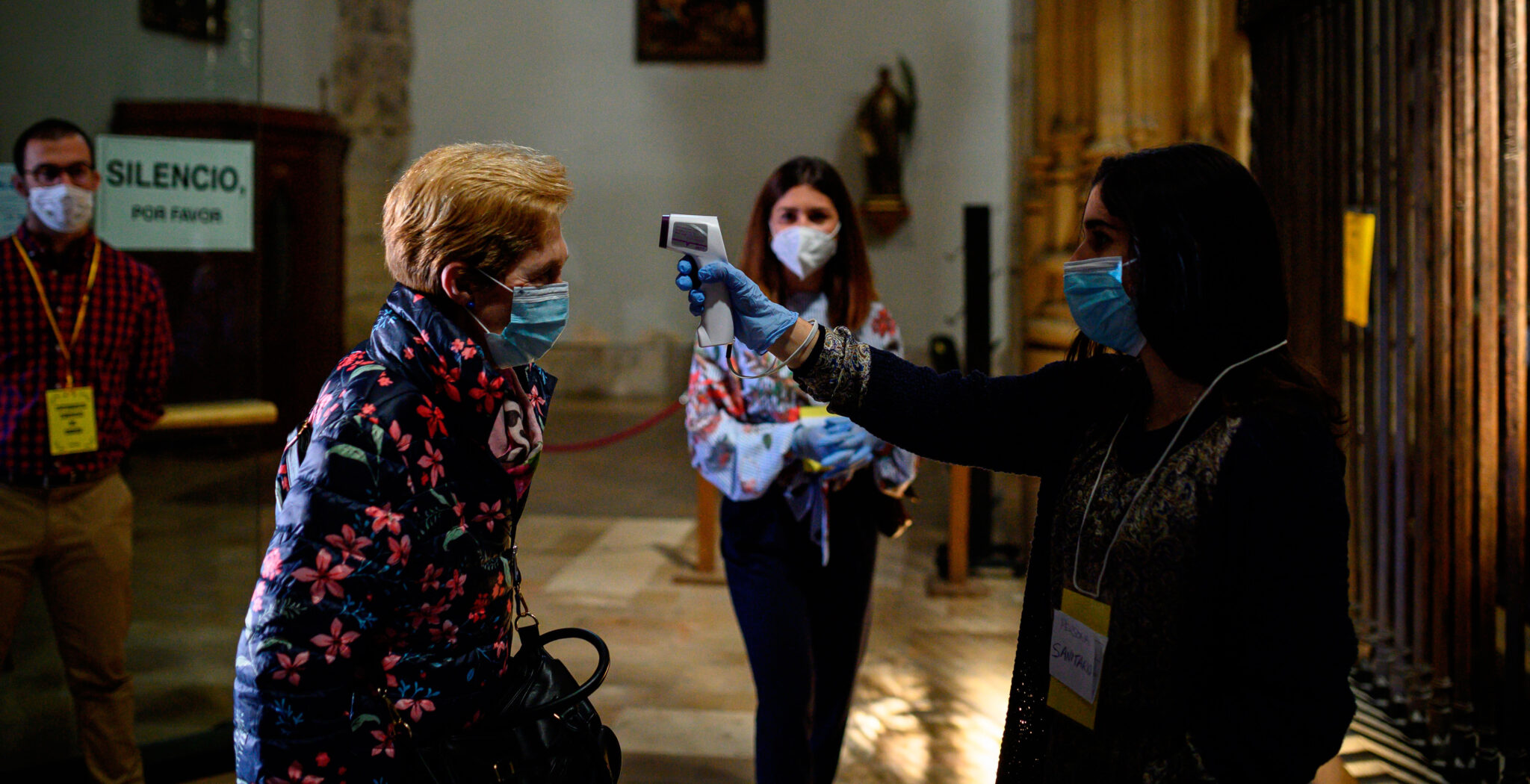 Una voluntaria toma la temperatura a los fieles que acuden a misa en la catedral de Alcalá de Henares