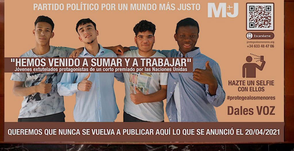 En ella, en el mismo lugar –la estación de metro de la Puerta del Sol de Madrid– donde el día 20 de abril, en plena campaña electoral a la Comunidad, aparecía un cartel alimentando el rechazo a los Menores Extranjeros No Acompañados, nuestro partido ha colocado otro con un mensaje muy distinto en fondo y forma: los niños “menas” no han venido a robar, delinquir o invadirnos… han venido a sumar y trabajar. Lo hacemos trayendo la historia de 4 jóvenes extutelados que han participado en un corto premiado por Naciones Unidas, y a la que seguirán a lo largo de un año otras historias de personas que llegaron a nuestro país huyendo de contextos de pobreza, violencia, miseria o persecución, y que hoy dan voz a las ganas de contribuir, co-crear y re-crear nuestra sociedad, que la inmensa mayoría de estos jóvenes traen consigo cuando se deciden a arriesgar su vida en un viaje que, está lleno de todo, menos de facilidades.