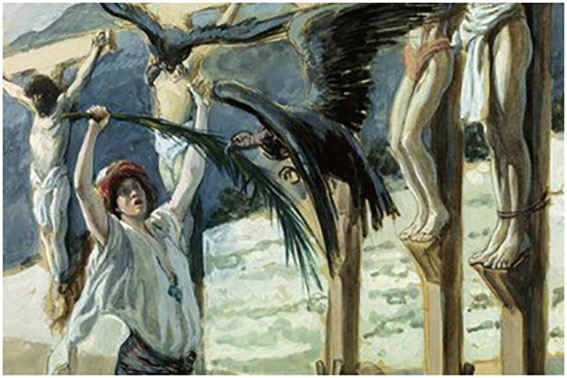 La imagen es paradójica porque el mensaje que envía está fuera de medida. Durante meses, desde el momento de la cosecha hasta el de las lluvias, Rispa protege los cuerpos de los siete ahorcados hasta que David decide juntar sus huesos con los de Saúl y su hijo Jonathan en un solo cementerio.
