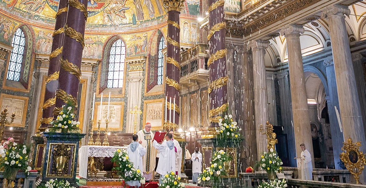 Más fieles que turistas, o más bien, turistas que no se olvidan de ser fieles, son en realidad los miles de visitantes de todos los rincones del planeta que acuden a esta iglesia especial en cualquier época del año. Es el mayor santuario occidental dedicado a la Virgen y al tiempo la basílica papal más antigua construida por inspiración directa de María quien, en el año 358 después de Cristo, se apareció al Papa Liberio y al patricio romano Juan pidiendo que se le dedicara un templo en el lugar que ella indicara. El milagro fue la nevada que se produjo el 5 de agosto aquí mismo, en el monte Esquilino. Desde entonces se recuerda cada año en la misma fecha con una lluvia de pétalos de flores blancas.