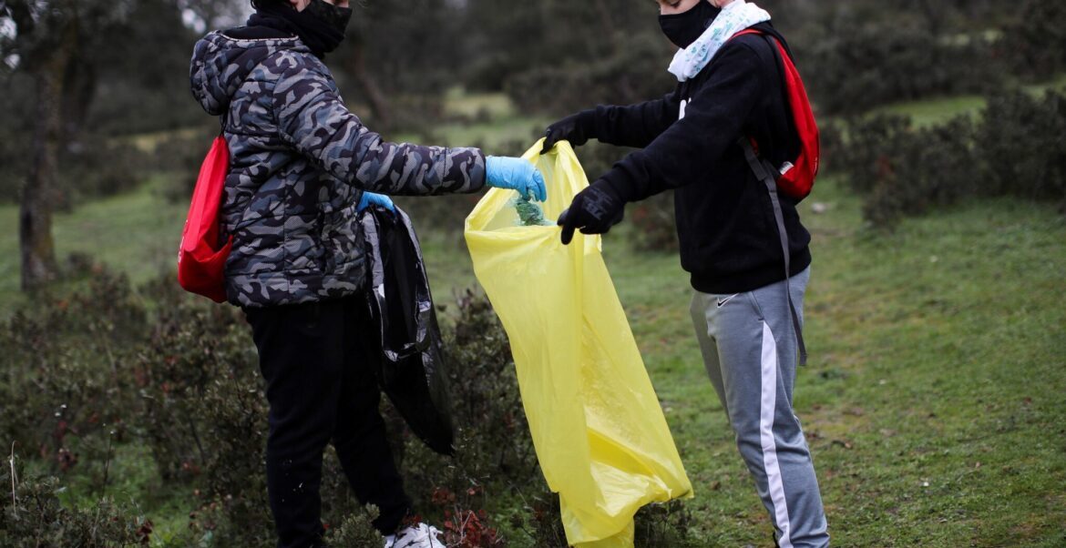 Varios estudiantes participan en la recogida de basura que forma parte del proyecto Libera en San Sebastián de los Reyes. EFE/David Fernández