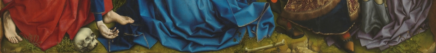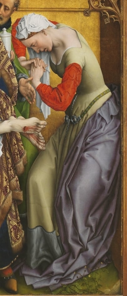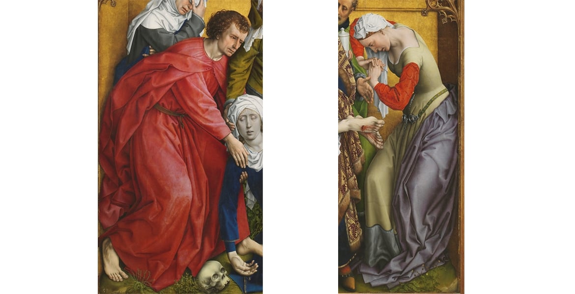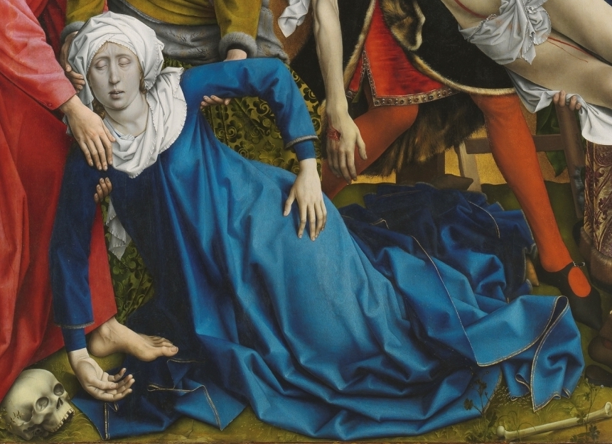 Más allá de Cristo y de su Madre, la única figura individualizada por su atributo iconográfico es María Magdalena, con el pomo de los ungüentos que nos habla tanto del entierro posterior como, principalmente, de la resurrección. La excelencia técnica de los pinceles de Van der Weyden, su capacidad de traducir expresiones y texturas diferenciadas, le convierte en uno de los mejores intérpretes de esta escena de la pasión.