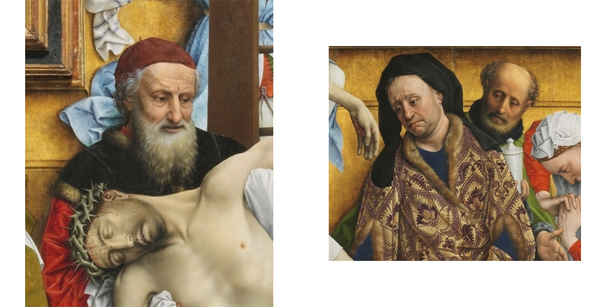 El realismo con que trabaja los rasgos ancianos de Nicodemo, o los de José de Arimatea, cuya riqueza se revela en el manto brocado de oro, han llevado a plantear que pudiera tratarse de retratos, ya que el pintor se ejercitó en este género en el taller de su maestro, Robert Campin. Una contemplación detenida de los rostros nos permite apreciar como Van der Weyden, mediante la aplicación de veladuras, hace caer lágrimas apenas perceptibles.