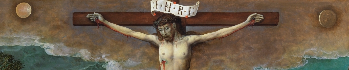 La cruz representada por Juan de Flandes, que responde a la tipología ‘decapitata’, propia de los primitivos flamencos, es rematada en su parte superior por una filacteria con la inscripción INRI (‘Iesus Nazarenus Rex Iudaeorum’), que presenta a Cristo como rey de los judíos. A los lados del travesaño horizontal, el sol y la luna, recordando el eclipse que se produjo en el instante de la muerte de Cristo (“Toda la tierra se cubrió de tinieblas hasta la ora nona. Se oscureció el sol…”, Lc 23, 44). Además, la representación del sol oscurecido implicaba el cumplimiento de la profecía de Amós: “Aquel día, dice el Señor Yaveh, haré que se ponga el sol a mediodía, y en pleno día tenderé las tinieblas sobre la tierra” (Amós 8, 8).