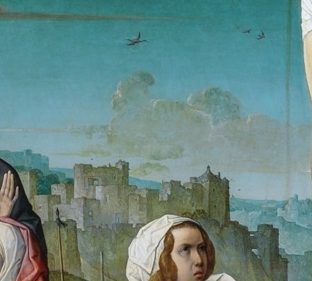 Como fondo de las figuras divisamos la ciudad de Jerusalén, en la que se advierten estructuras centralizadas anacrónicas que evocan la arquitectura del Santo Sepulcro. Sobre el cielo, con esquemáticos trazos, las aves, también han sido interpretadas en la clave simbólica propia de los primitivos flamencos e inspirada en este caso en ‘La Historia Natural’ de Plinio: a la derecha dos lechuzas, propias del mundo de la oscuridad y de la muerte, y a la izquierda dos golondrinas que evocan la resurrección de Cristo.