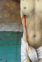 En su costado se abre la llaga de la que brotan agua y sangre (Jn 19, 34), símbolos de bautismo y eucaristía a partir de las exégesis patrísticas. Estos mismos escritos había referido como la llaga del costado simbolizaba el nacimiento de la Iglesia, a su vez prefigurado por el nacimiento de Eva del costado de Adán.