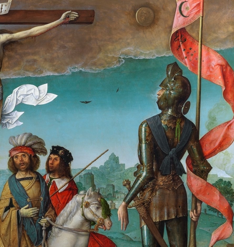 Su imagen de arrepentimiento y conversión se contrapone a la actitud del segundo jinete, cuyo rostro denota cierta indiferencia ante el crucificado. El dominio técnico de Juan de Flandes, reflejado en los aderezos del caballo, en la rugosidad de las plumas, los brillos de los rasos o la dureza de las piedras, se completa con el tratamiento de brillos y reflejos de la anacrónica armadura del primer término de la pintura. Este soldado, considerado el lancero que traspasa el soldado de Cristo, recuerda el cumplimiento de las Escrituras: “Esto sucedió para que se cumpliera la Escritura, que dice: ‘No le quebrarán ningún hueso’. La Escritura dice también en otro pasaje: ‘Mirarán al que traspasaron” (Jn 19, 37-37). Su posición, de espaldas al espectador, subraya la sucesión de planos compositivos en esta pintura, pero sobre todo invita al fiel a contemplar al Crucificado con la misma veneración que él lo contempla. Personaje y fiel quedan identificados en la contemplación de Cristo.
